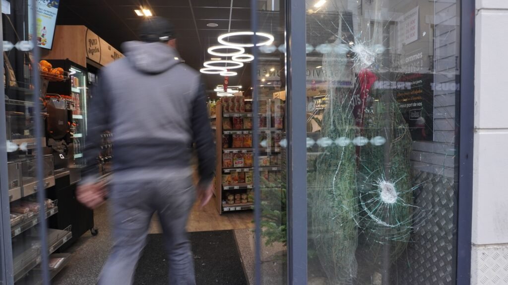 Nanterre (Hauts-de-Seine), le 15 décembre 2025. Six impacts sont visibles sur la devanture du Carrefour City de la rue Maurice Thorez, le résultat de plusieurs actes de vandalisme. © Chloé Blanc, IPJ