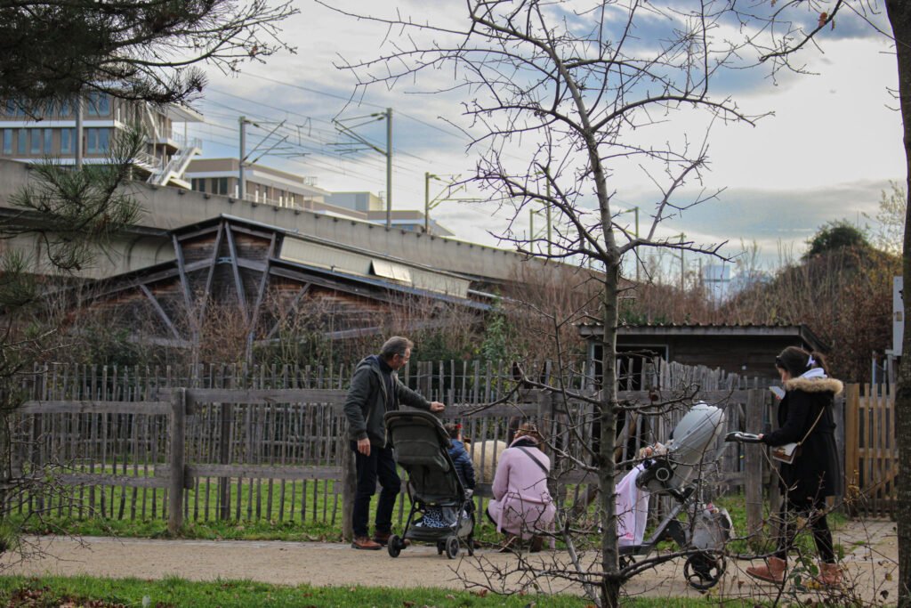 Lola, du fond de sa poussette, babille face à un âne et une brebis dans leur enclos. Ses grands-parents viennent souvent ici lorsqu’ils gardent la petite. « C’est un parc agréable, ce n’est pas la campagne non plus mais ce n’est pas mal pour la proche couronne », estime satisfait le grand-père de Lola, Pascal. À leurs côtés, Nathalie renchérit : « Et vu que le parc est très grand, il y a des endroits de calme sans bruit de voitures ou d’avions ». Car l’enclos est juste en-dessous de l’autoroute A14 et d’un viaduc ferroviaire, interrompant à intervalles fréquents le calme du parc.